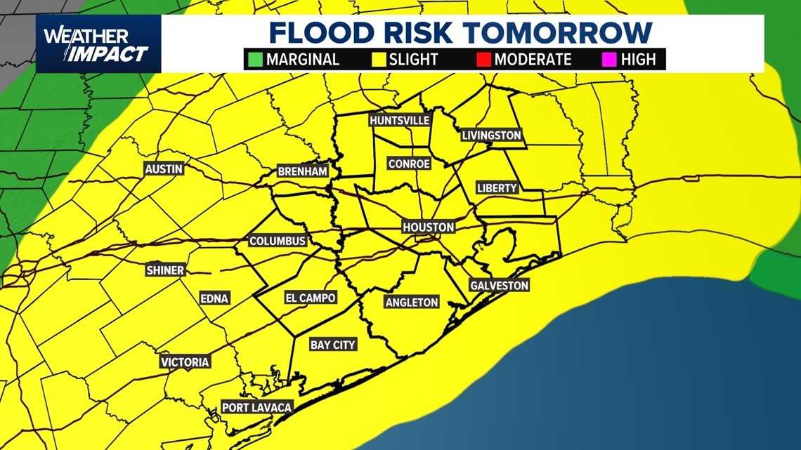 A slight flood danger extends throughout the Houston metro space, with reasonable danger zones additional north and west, together with Brenham, Huntsville, and Austin. Storms this afternoon might convey heavy downpours, particularly to already saturated areas, elevating the chance of road flooding and low-lying water accumulation.