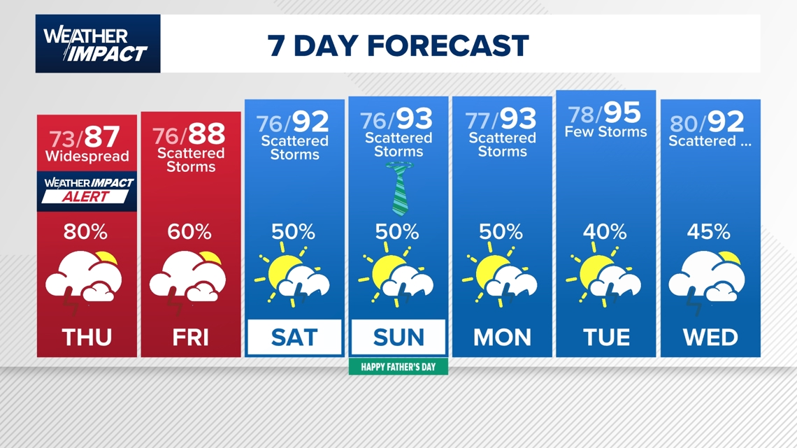 - Father’s Day (Sunday) is trending drier however nonetheless heat.